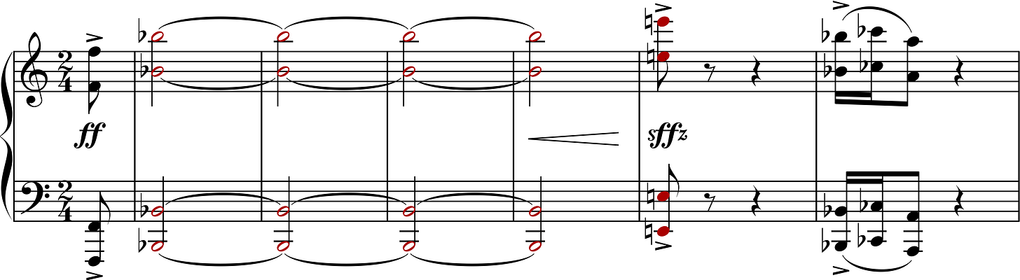 Immediately, as an audience we can hear tension. Even before any words are spoken or sung, we know that the story is going to focus on conflict — in this case between the two gangs. Bernstein brilliantly develops the use of this melody and tritones throughout the rest of the “Prologue” growing to this explosion from the full orchestra: