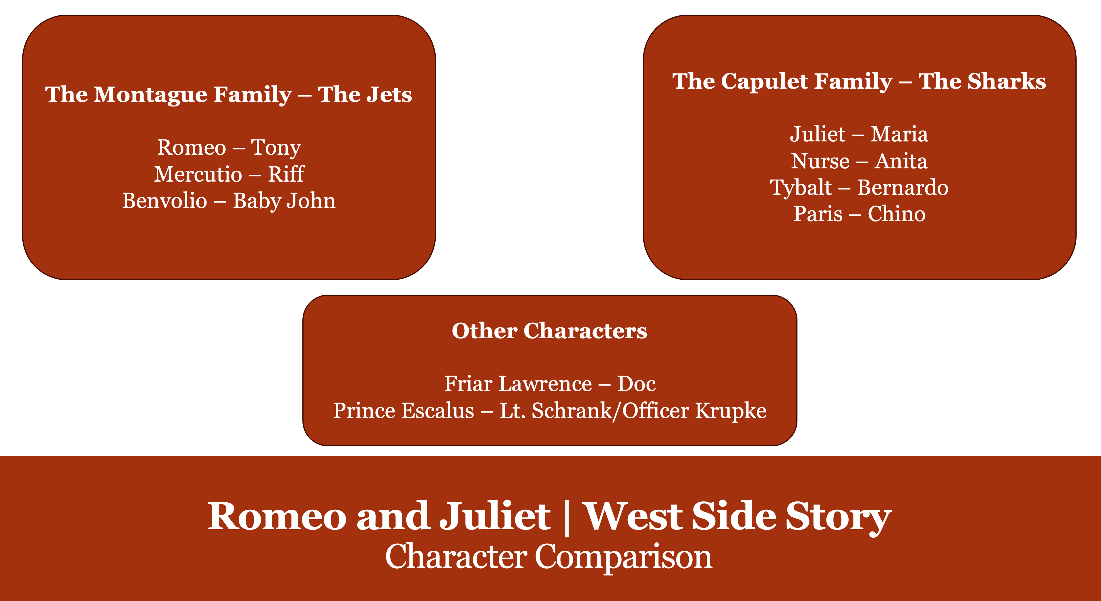 I don’t want to do a whole deep dive into the similarities and differences between Romeo and Juliet and West Side Story, but I do think this chart will help give context to how the characters in the two shows are related:
